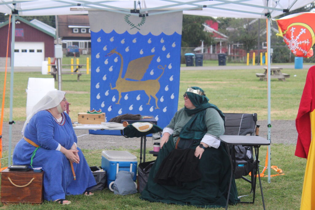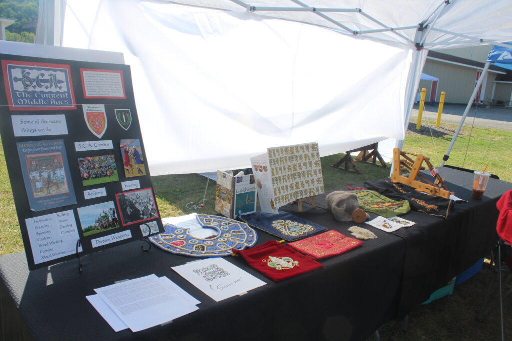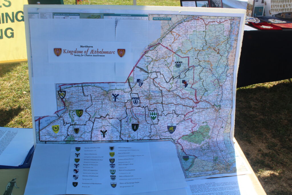 Lady Ruth, Cat, and Baroness Nest showed A&S with a spinning wheel and other various crafts. Lady Ruth made a magnificent kingdom map to help guests learn where to find their local SCA groups.